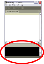 Processing, como cualquier entorno de programación que se precie, tiene una consola. Un espacio donde, vía texto, podemos recibir mensajes del programa y, cuando los haya, ver y descifrar los errores. La consola de Processing se encuentra debajo del todo en la interfaz de Processing, con fondo negro.